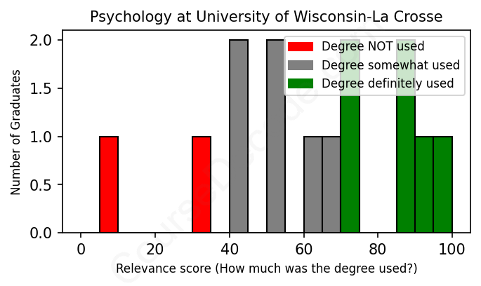 The verdict? Below average. Overall, with an average relevance score of 61%, Psychology graduates from University of Wisconsin-La Crosse have a lower likelihood (-6%) of finding work in this field compared to the average graduate across all fields:
