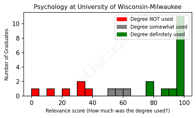 The verdict? Slightly above average. Overall, with an average relevance score of 71%, Psychology graduates from University of Wisconsin-Milwaukee have a slightly higher likelihood (+4%) of finding work in this field compared to the average graduate across all fields: