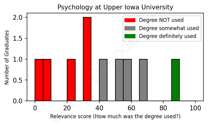The verdict? Bad. Overall, with an average relevance score of 39%, Psychology graduates from Upper Iowa University have a substantially lower likelihood (-28%) of finding work in this field compared to the average graduate across all fields: