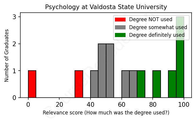 The verdict? Slightly below average. Overall, with an average relevance score of 63%, Psychology graduates from Valdosta State University have a slightly lower likelihood (-4%) of finding work in this field compared to the average graduate across all fields: