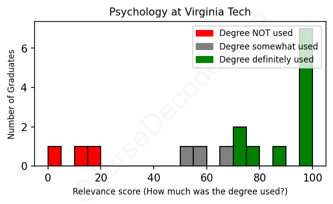 The verdict? Slightly above average. Overall, with an average relevance score of 71%, Psychology graduates from Virginia Tech have a slightly higher likelihood (+4%) of finding work in this field compared to the average graduate across all fields: