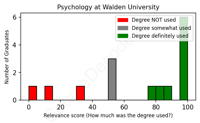The verdict? Slightly above average. Overall, with an average relevance score of 69%, Psychology graduates from Walden University have a slightly higher likelihood (+2%) of finding work in this field compared to the average graduate across all fields: