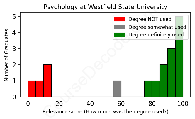 The verdict? Slightly above average. Overall, with an average relevance score of 69%, Psychology graduates from Westfield State University have a slightly higher likelihood (+2%) of finding work in this field compared to the average graduate across all fields: