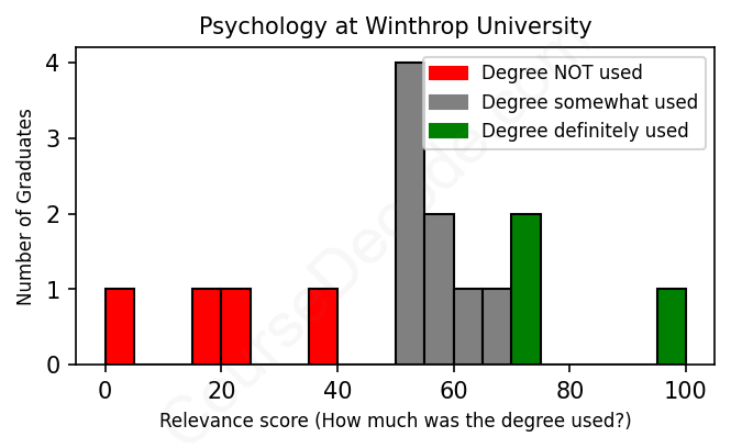 The verdict? Significantly below average. Overall, with an average relevance score of 51%, Psychology graduates from Winthrop University have a much lower likelihood (-16%) of finding work in this field compared to the average graduate across all fields: