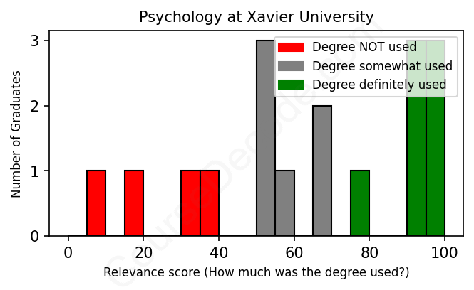 The verdict? Slightly below average. Overall, with an average relevance score of 64%, Psychology graduates from Xavier University have a slightly lower likelihood (-3%) of finding work in this field compared to the average graduate across all fields: