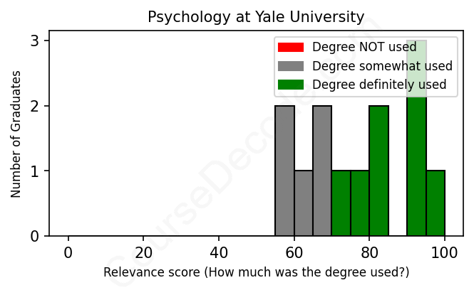 The verdict? Above average. Overall, with an average relevance score of 76%, Psychology graduates from Yale University have a higher likelihood (+9%) of finding work in this field compared to the average graduate across all fields: