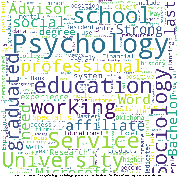 Here is a visual representation of the most common words seen in the "about" section of LinkedIn profiles who have a Bachelor degree in Psychology, Sociology. This may or may not be useful: