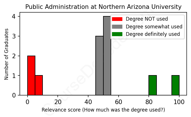 The verdict? Bad. Overall, with an average relevance score of 44%, Public Administration graduates from Northern Arizona University have a substantially lower likelihood (-23%) of finding work in this field compared to the average graduate across all fields: