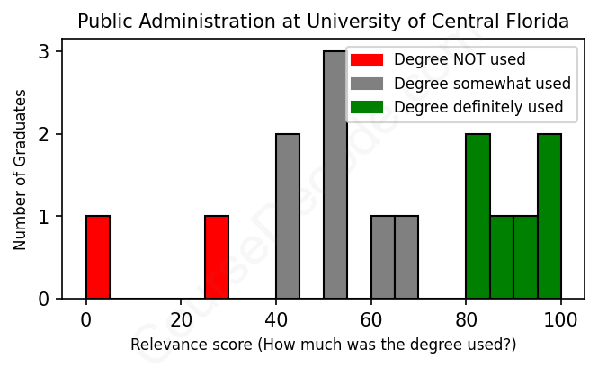 The verdict? Below average. Overall, with an average relevance score of 61%, Public Administration graduates from University of Central Florida have a lower likelihood (-6%) of finding work in this field compared to the average graduate across all fields: