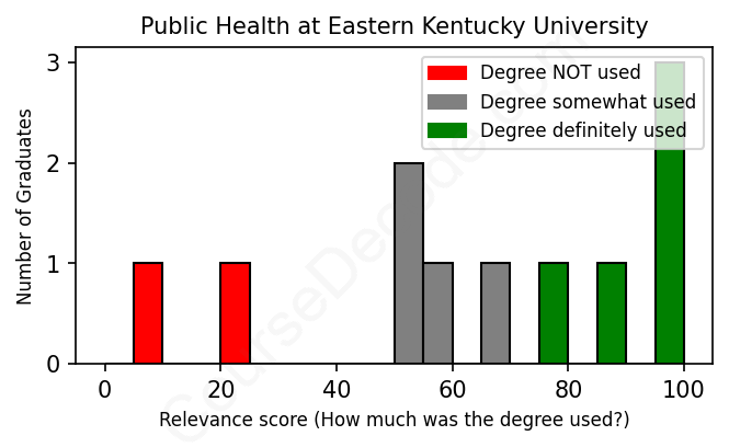 The verdict? Slightly below average. Overall, with an average relevance score of 64%, Public Health graduates from Eastern Kentucky University have a slightly lower likelihood (-3%) of finding work in this field compared to the average graduate across all fields:
