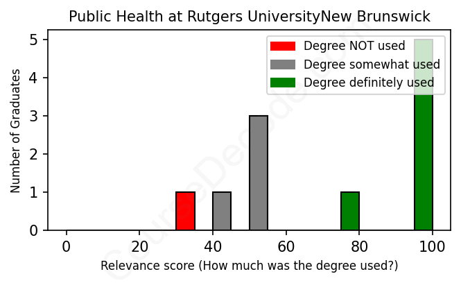 The verdict? Slightly above average. Overall, with an average relevance score of 72%, Public Health graduates from Rutgers UniversityNew Brunswick have a slightly higher likelihood (+5%) of finding work in this field compared to the average graduate across all fields: