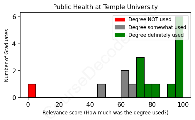 The verdict? Above average. Overall, with an average relevance score of 76%, Public Health graduates from Temple University have a higher likelihood (+9%) of finding work in this field compared to the average graduate across all fields: