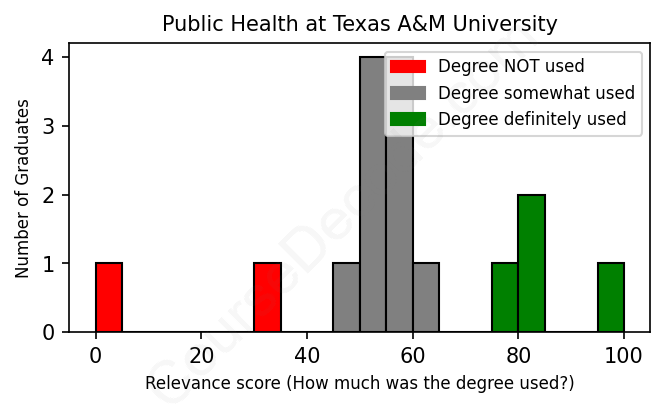 The verdict? Significantly below average. Overall, with an average relevance score of 56%, Public Health graduates from Texas A&M University have a much lower likelihood (-11%) of finding work in this field compared to the average graduate across all fields: