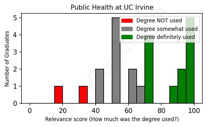 The verdict? On par with the average. Overall, with an average relevance score of 67%, Public Health graduates from UC Irvine have about the same likelihood of finding work in this field as the average graduate across all fields: