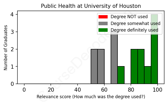 The verdict? Above average. Overall, with an average relevance score of 77%, Public Health graduates from University of Houston have a higher likelihood (+10%) of finding work in this field compared to the average graduate across all fields: