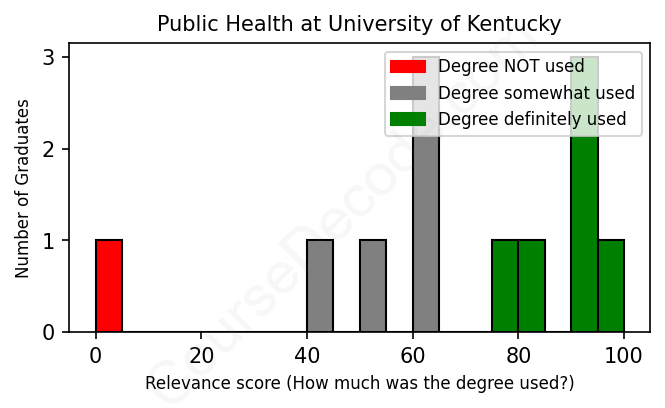 The verdict? On par with the average. Overall, with an average relevance score of 67%, Public Health graduates from University of Kentucky have about the same likelihood of finding work in this field as the average graduate across all fields: