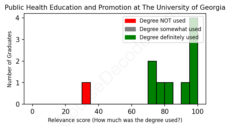 First, some facts. Of the Public Health Education and Promotion graduates from The University of Georgia we've analyzed , here's how many have used (or NOT used) their degree in their career: