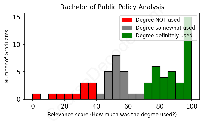 The verdict? On par with the average. Overall, with an average relevance score of 67%, Public Policy Analysis graduates have about the same likelihood of finding work in this field as the average graduate across all fields: