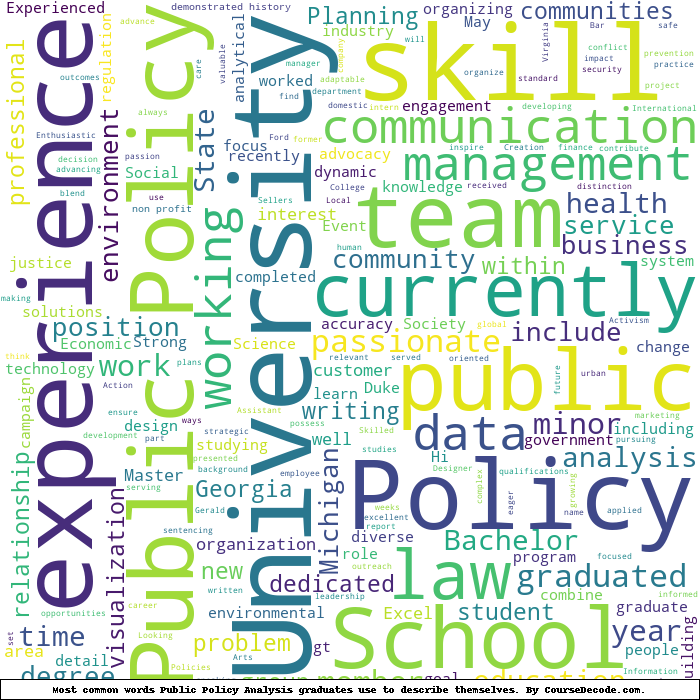 Here is a visual representation of the most common words seen in the "about" section of LinkedIn profiles who have a Bachelor degree in Public Policy Analysis. This may or may not be useful: