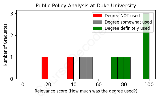 The verdict? On par with the average. Overall, with an average relevance score of 67%, Public Policy Analysis graduates from Duke University have about the same likelihood of finding work in this field as the average graduate across all fields: