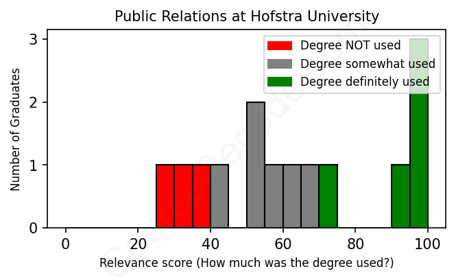 The verdict? Slightly below average. Overall, with an average relevance score of 62%, Public Relations graduates from Hofstra University have a slightly lower likelihood (-5%) of finding work in this field compared to the average graduate across all fields: