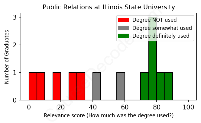 The verdict? Significantly below average. Overall, with an average relevance score of 50%, Public Relations graduates from Illinois State University have a much lower likelihood (-17%) of finding work in this field compared to the average graduate across all fields:
