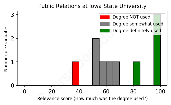 The verdict? Slightly above average. Overall, with an average relevance score of 70%, Public Relations graduates from Iowa State University have a slightly higher likelihood (+3%) of finding work in this field compared to the average graduate across all fields: