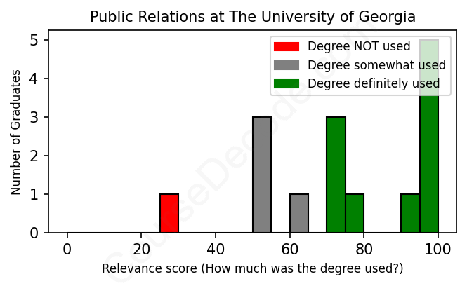 The verdict? Above average. Overall, with an average relevance score of 73%, Public Relations graduates from The University of Georgia have a higher likelihood (+6%) of finding work in this field compared to the average graduate across all fields: