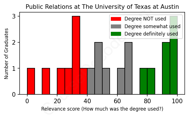 The verdict? Significantly below average. Overall, with an average relevance score of 55%, Public Relations graduates from The University of Texas at Austin have a much lower likelihood (-12%) of finding work in this field compared to the average graduate across all fields: