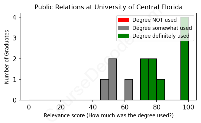 The verdict? Above average. Overall, with an average relevance score of 75%, Public Relations graduates from University of Central Florida have a higher likelihood (+8%) of finding work in this field compared to the average graduate across all fields: