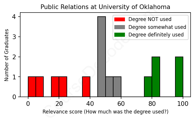 The verdict? Significantly below average. Overall, with an average relevance score of 50%, Public Relations graduates from University of Oklahoma have a much lower likelihood (-17%) of finding work in this field compared to the average graduate across all fields: