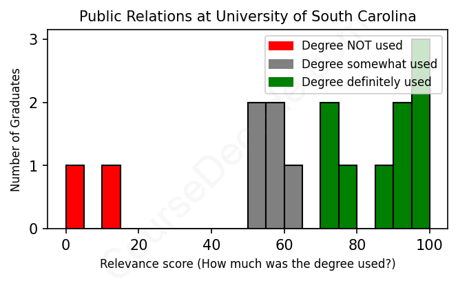The verdict? On par with the average. Overall, with an average relevance score of 67%, Public Relations graduates from University of South Carolina have about the same likelihood of finding work in this field as the average graduate across all fields: