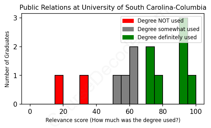 The verdict? On par with the average. Overall, with an average relevance score of 67%, Public Relations graduates from University of South Carolina-Columbia have about the same likelihood of finding work in this field as the average graduate across all fields: