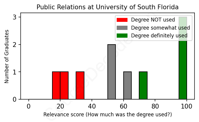 First, some facts. Of the Public Relations graduates from University of South Florida we've analyzed , here's how many have used (or NOT used) their degree in their career: