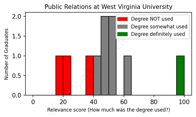 The verdict? Significantly below average. Overall, with an average relevance score of 47%, Public Relations graduates from West Virginia University have a much lower likelihood (-20%) of finding work in this field compared to the average graduate across all fields: