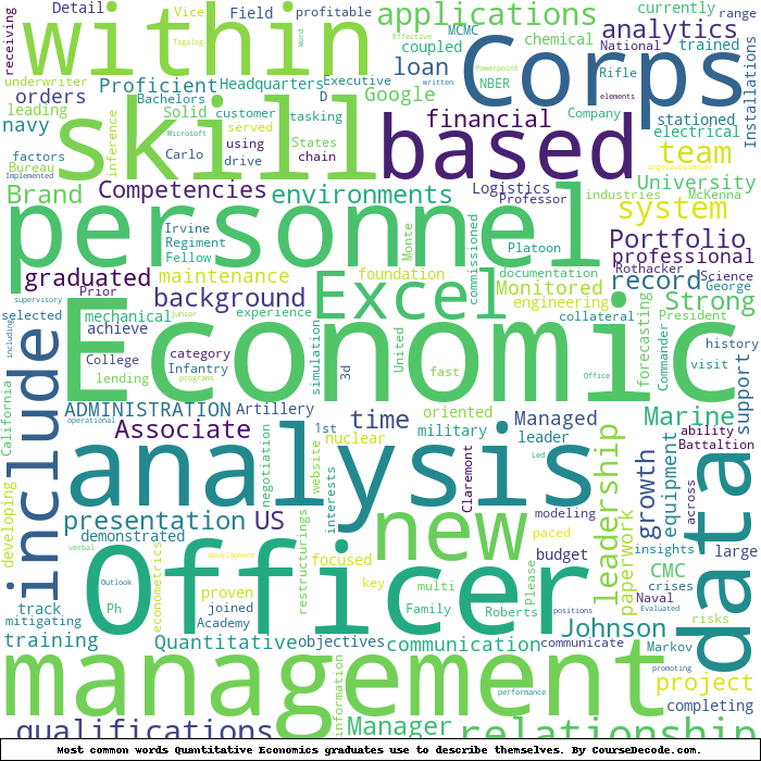 Here is a visual representation of the most common words seen in the "about" section of LinkedIn profiles who have a Bachelor degree in Quantitative Economics (this is across all Quantitative Economics graduates we've analyzed, not just those who went to United States Naval Academy). This may or may not be useful: