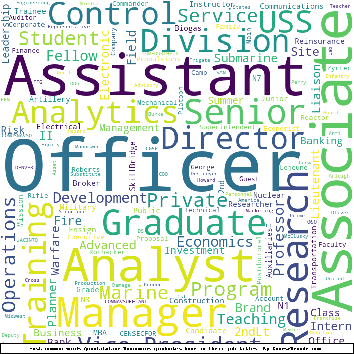 Here is a visual representation of the most common words in job titles for Quantitative Economics graduates (this is across all Quantitative Economics graduates we've analyzed, not just those who went to United States Naval Academy):