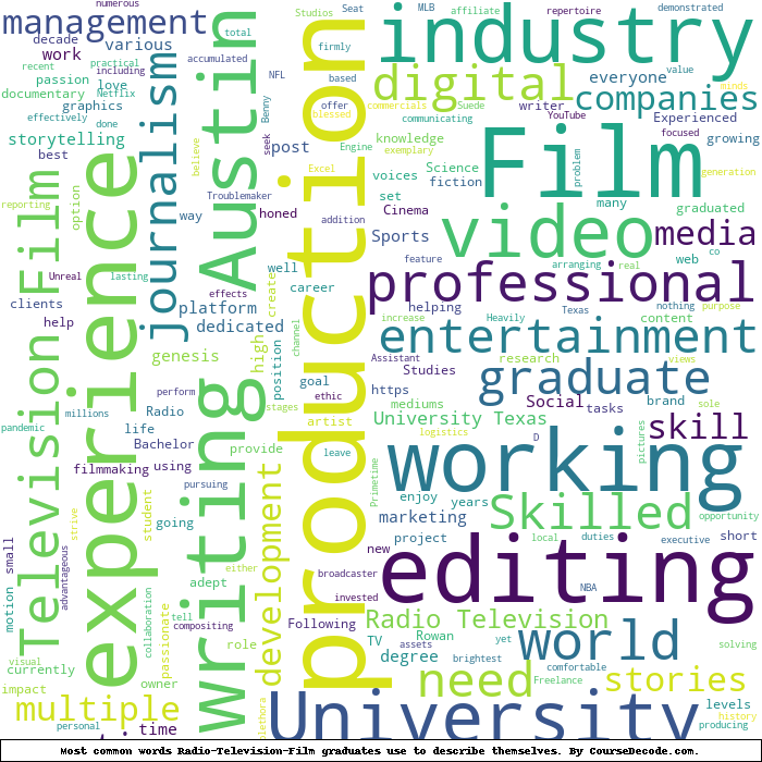 Here is a visual representation of the most common words seen in the "about" section of LinkedIn profiles who have a Bachelor degree in Radio-Television-Film (this is across all Radio-Television-Film graduates we've analyzed, not just those who went to The University of Texas at Austin). This may or may not be useful: