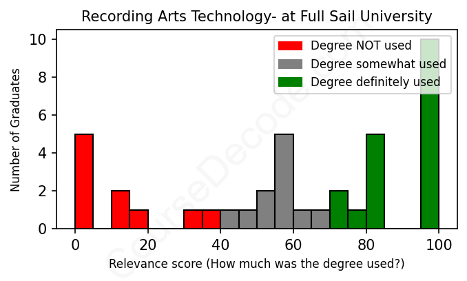 The verdict? Below average. Overall, with an average relevance score of 60%, Recording Arts Technology- graduates from Full Sail University have a lower likelihood (-7%) of finding work in this field compared to the average graduate across all fields: