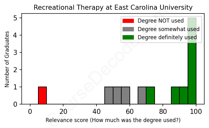 The verdict? Above average. Overall, with an average relevance score of 75%, Recreational Therapy graduates from East Carolina University have a higher likelihood (+8%) of finding work in this field compared to the average graduate across all fields:
