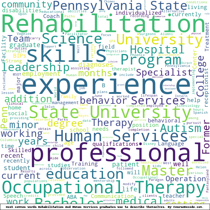 Here is a visual representation of the most common words seen in the "about" section of LinkedIn profiles who have a Bachelor degree in Rehabilitation And Human Services (this is across all Rehabilitation And Human Services graduates we've analyzed, not just those who went to Penn State University). This may or may not be useful: