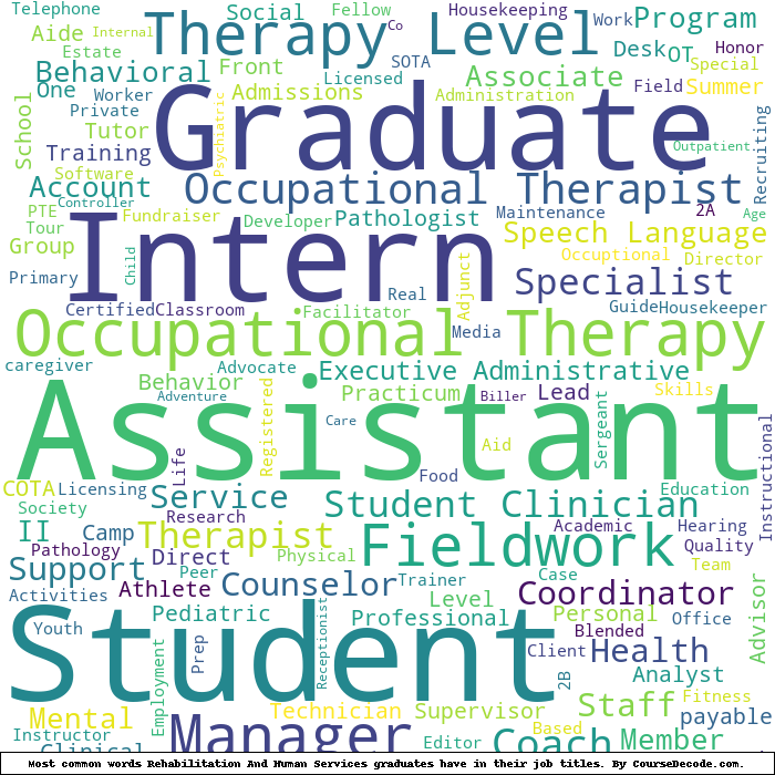 Here is a visual representation of the most common words in job titles for Rehabilitation And Human Services graduates (this is across all Rehabilitation And Human Services graduates we've analyzed, not just those who went to Penn State University):