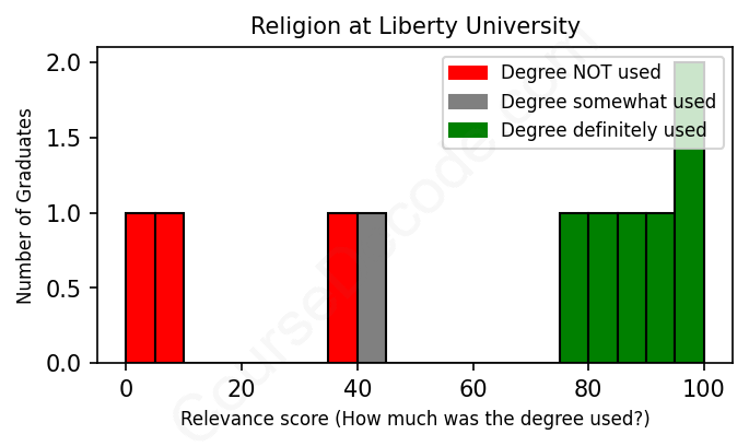 The verdict? Slightly below average. Overall, with an average relevance score of 62%, Religion graduates from Liberty University have a slightly lower likelihood (-5%) of finding work in this field compared to the average graduate across all fields: