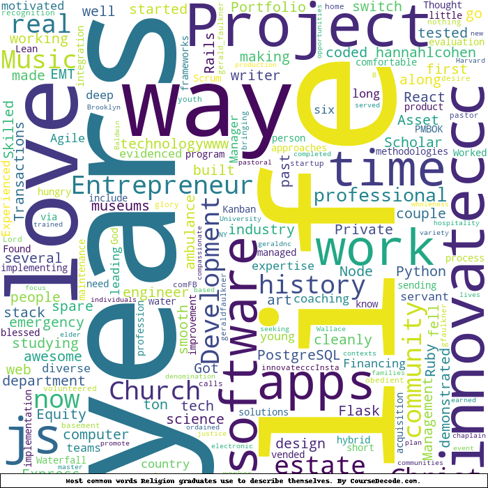 Here is a visual representation of the most common words seen in the "about" section of LinkedIn profiles who have a Bachelor degree in Religion (this is across all Religion graduates we've analyzed, not just those who went to Liberty University). This may or may not be useful: