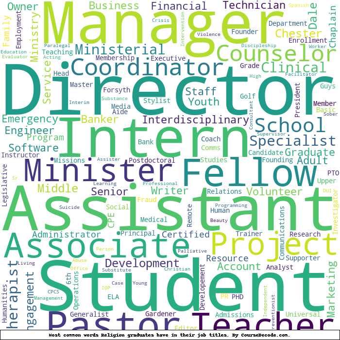 Here is a visual representation of the most common words in job titles for Religion graduates (this is across all Religion graduates we've analyzed, not just those who went to Liberty University):