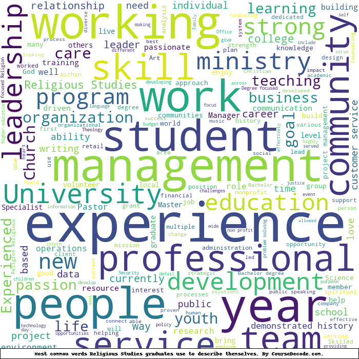 Here is a visual representation of the most common words seen in the "about" section of LinkedIn profiles who have a Bachelor degree in Religious Studies. This may or may not be useful: