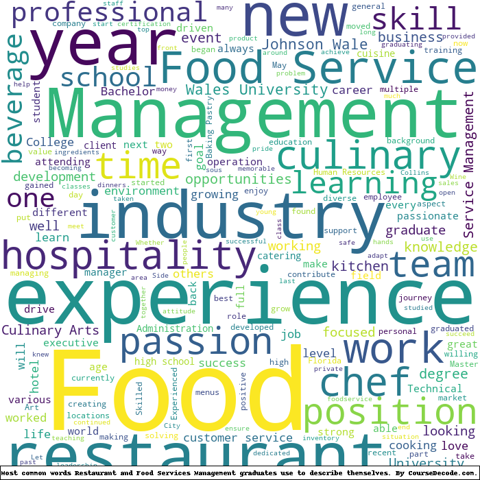 Here is a visual representation of the most common words seen in the "about" section of LinkedIn profiles who have a Bachelor degree in Restaurant and Food Services Management. This may or may not be useful: