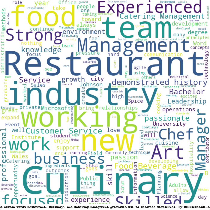 Here is a visual representation of the most common words seen in the "about" section of LinkedIn profiles who have a Bachelor degree in Restaurant, Culinary, and Catering Management. This may or may not be useful:
