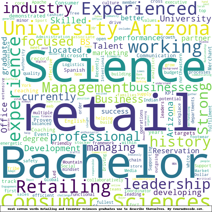 Here is a visual representation of the most common words seen in the "about" section of LinkedIn profiles who have a Bachelor degree in Retailing and Consumer Sciences (this is across all Retailing and Consumer Sciences graduates we've analyzed, not just those who went to University of Arizona). This may or may not be useful: