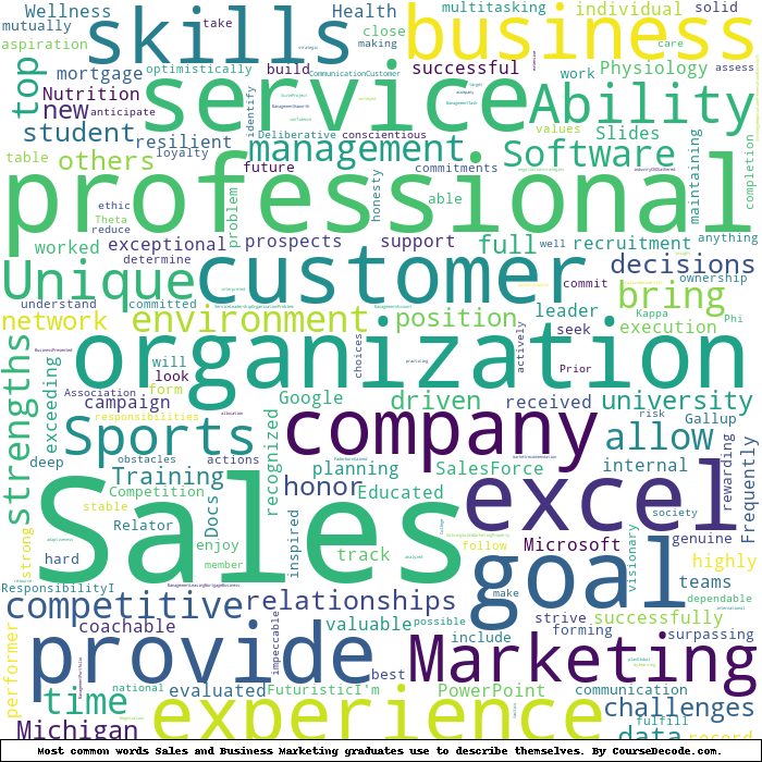 Here is a visual representation of the most common words seen in the "about" section of LinkedIn profiles who have a Bachelor degree in Sales and Business Marketing (this is across all Sales and Business Marketing graduates we've analyzed, not just those who went to Western Michigan University). This may or may not be useful: